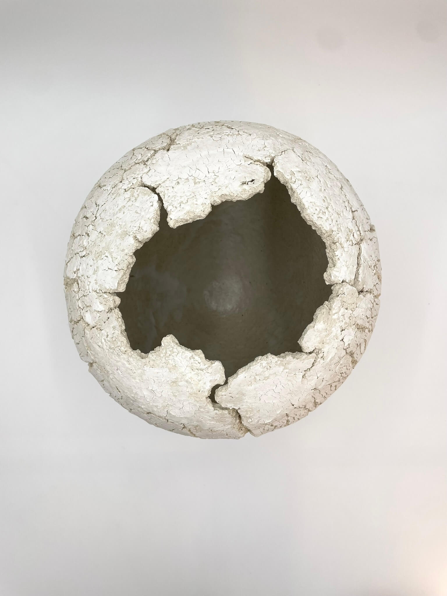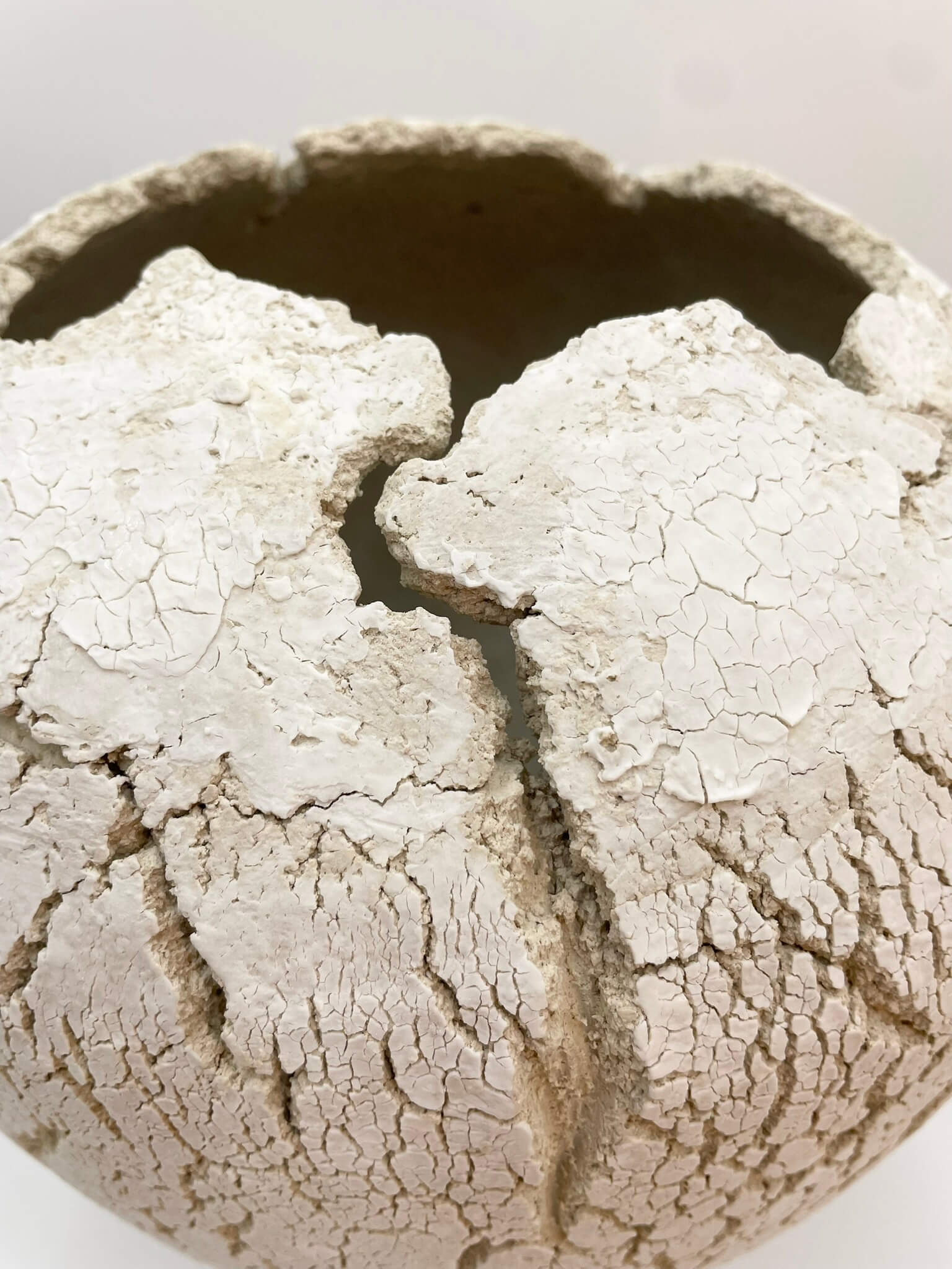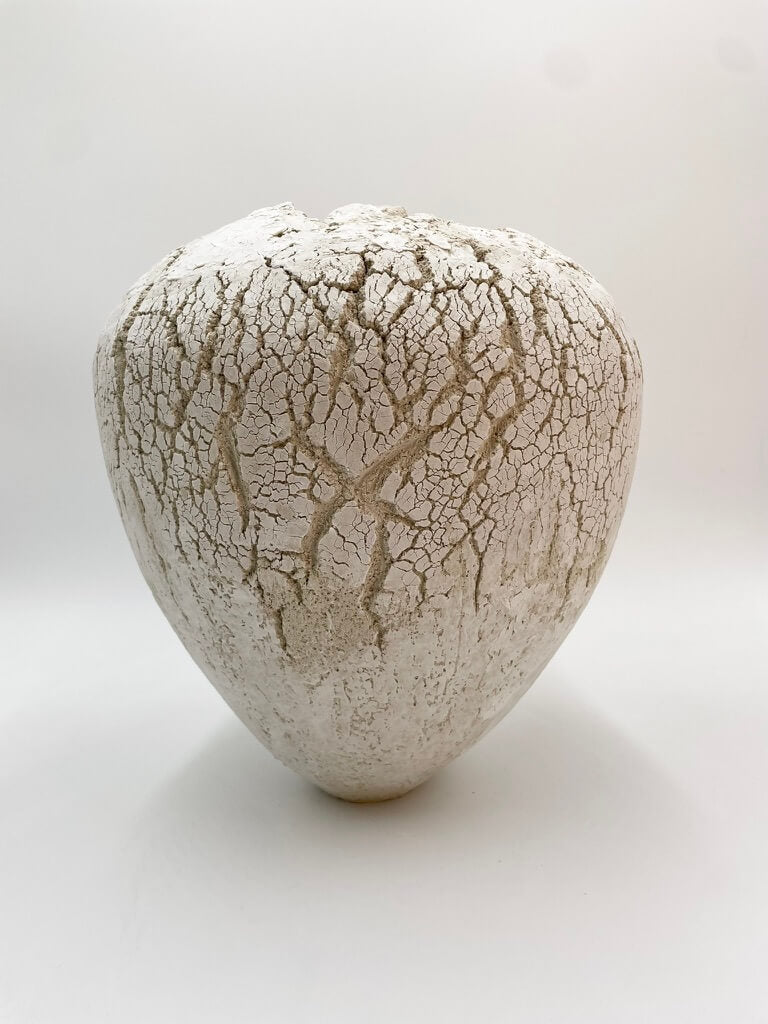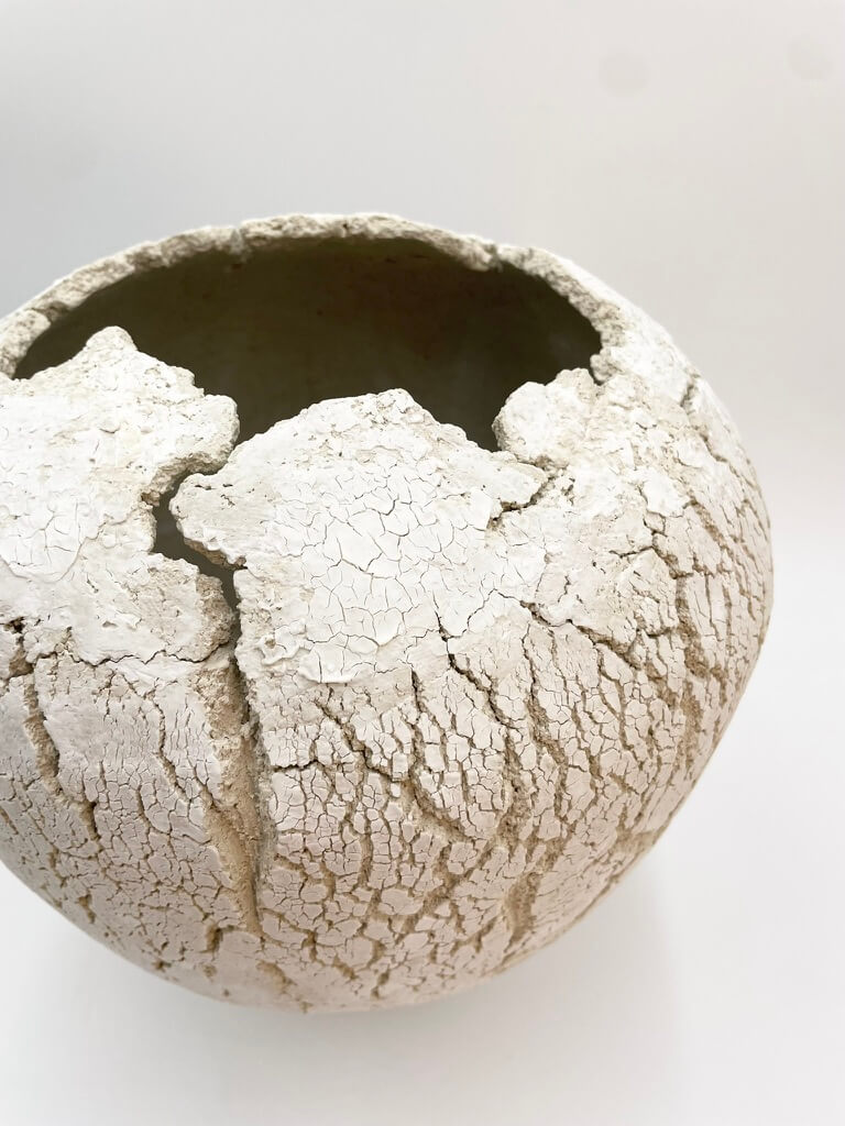 Handmade one of a kind stoneware vessel featuring a raw clay exterior with a cracked surface and porcelain slip. Inspired by nature’s raw beauty, each piece showcases organic textures and earthy elements, reflecting the harmony between material and form. Interior glazed.