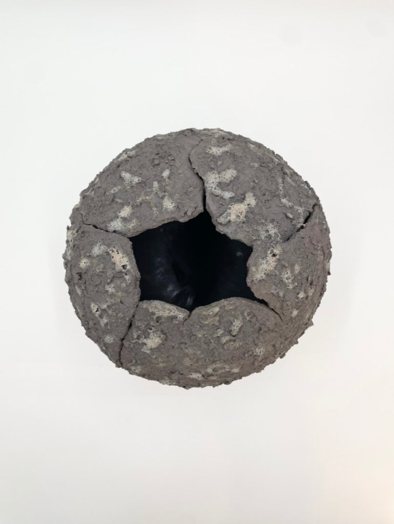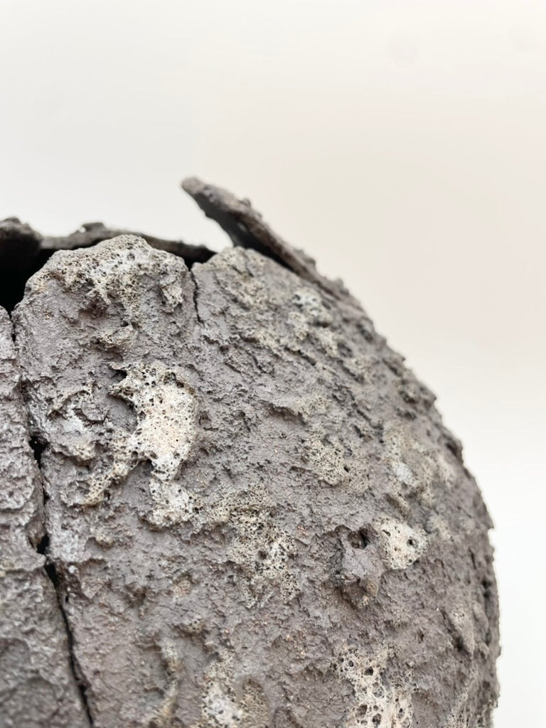 A hand-made, ball-shaped vessel in stoneware, featuring a raw clay exterior with a slip finish that highlights natural, earthy tones. The smooth, glazed interior offers a striking contrast, resulting in a balanced piece that evokes the organic beauty of nature.
