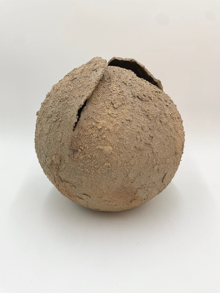 A hand-made, ball-shaped vessel in stoneware, featuring a raw clay exterior with a slip finish that highlights natural, earthy tones. The smooth, glazed interior offers a striking contrast, resulting in a balanced piece that evokes the organic beauty of nature.